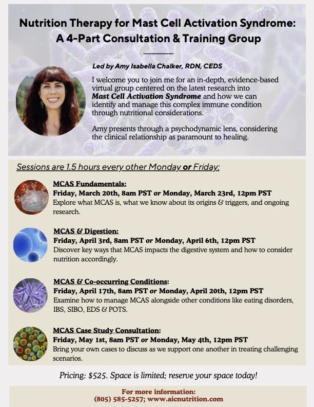 Relying on the latest evidence-based, peer-reviewed studies, supervision from clinical leaders in the field, and hands-on work with clients, Amy is excited to offer a new cohort the opportunity to delve into the best ways to support and manage MCAS through nutrition therapy, including recognizing the condition in the first place, managing common co-occurring chronic conditions, all while continuing to support best feeding practices, whether individuals have an eating disorder or not.
